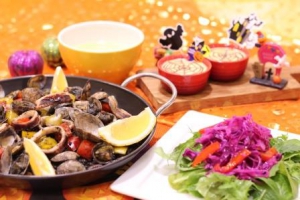ハロウィンカラーの食卓でパーティーを盛り上げよう!講師 TG-com 対象 男女混合 12名 受講料 2,800円(税込) メニュー イカスミのパエリア